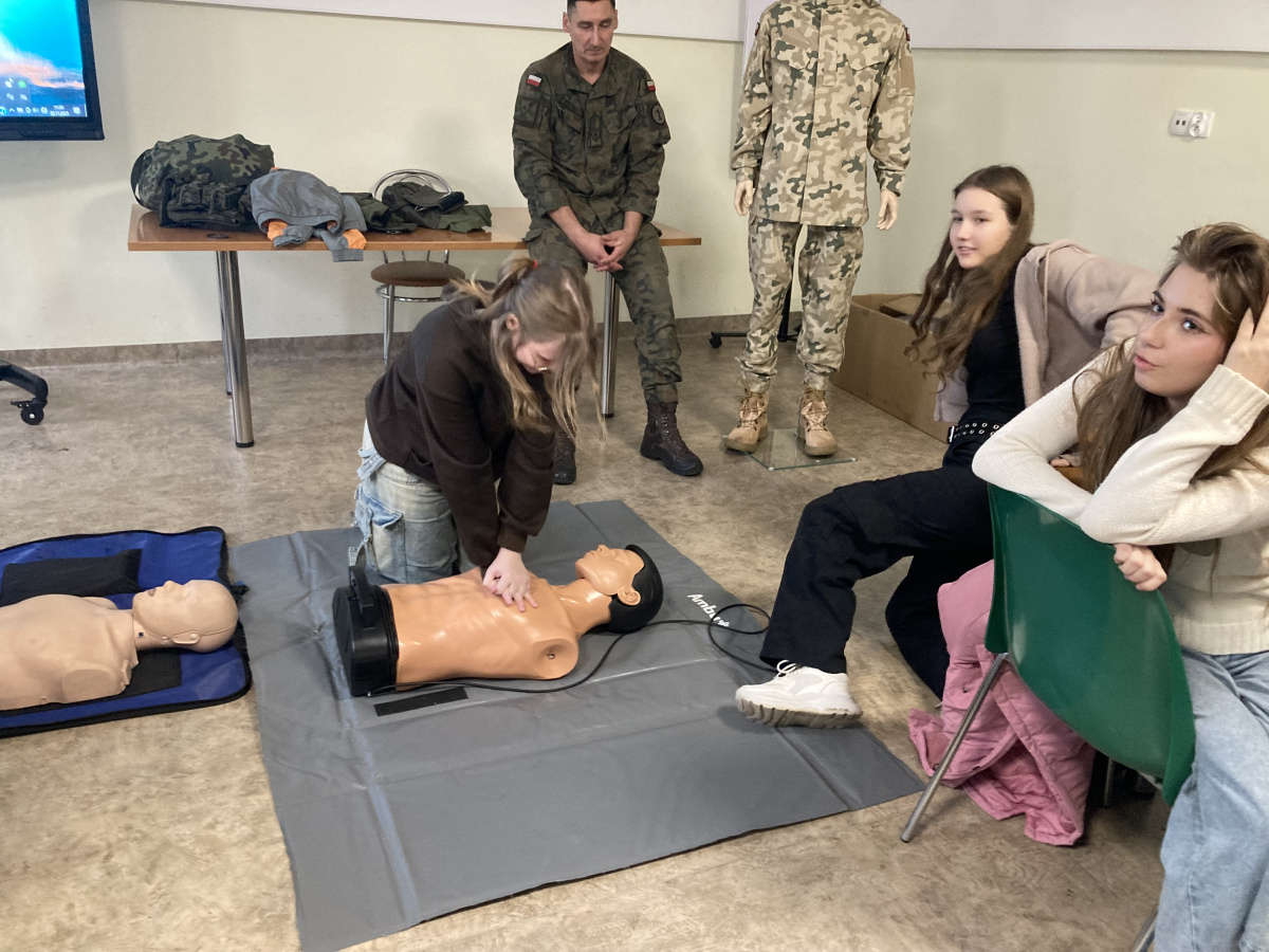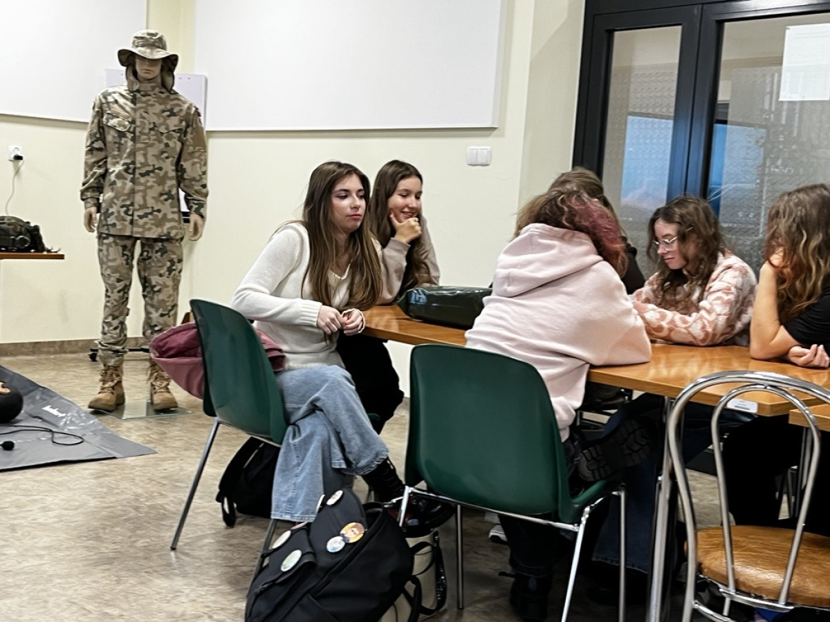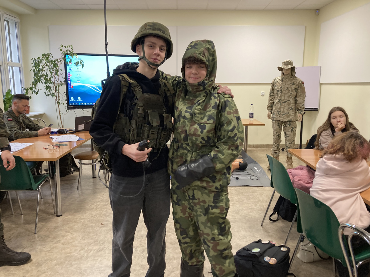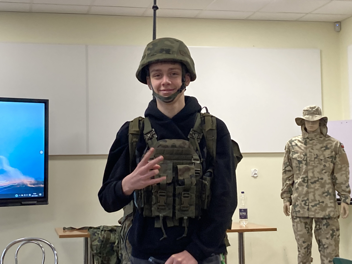 Podczas zajęć projektu „Edukacja z wojskiem” uczniowie zapoznali się m.in. z zasadami alarmowania, sposobami wzywania pomocy, podstawami ewakuacji i odnajdowania schronienia, technikami udzielania pierwszej pomocy, budowania odporności na zagrożenia informacyjne czy reagowania w sytuacji kontaktu z niezidentyfikowanymi obiektami. Wiemy jak wygląda plecak wojskowy i co powinien zawierać plecak ucieczkowy. Dowiedzieliśmy się też w jakich misjach brali udział żołnierze WP oraz ile takie misje trwają. Mieliśmy też okazję spotkania z weteranem misji poza granicami państwa, który udostępnił nam zbiór ciekawych zdjęć z kolekcji prywatnej.