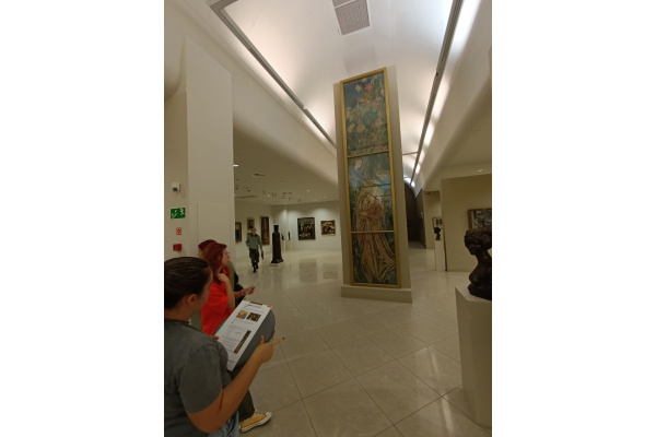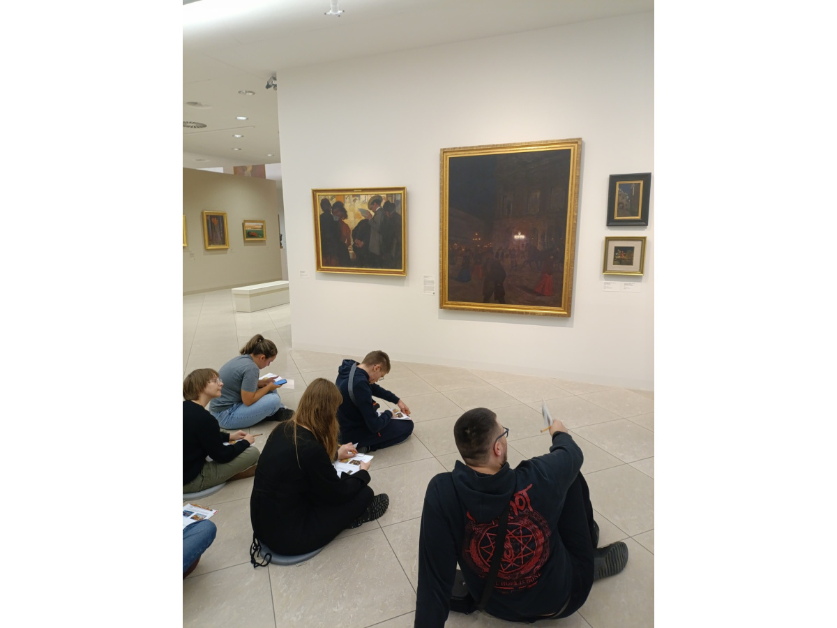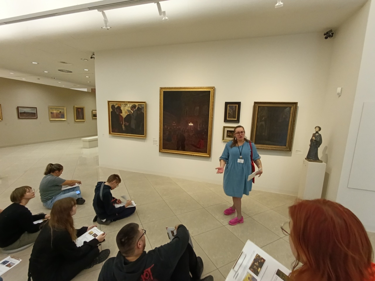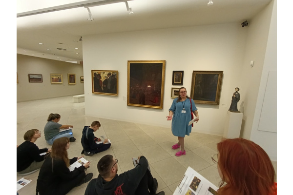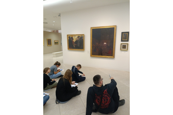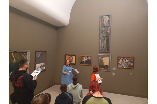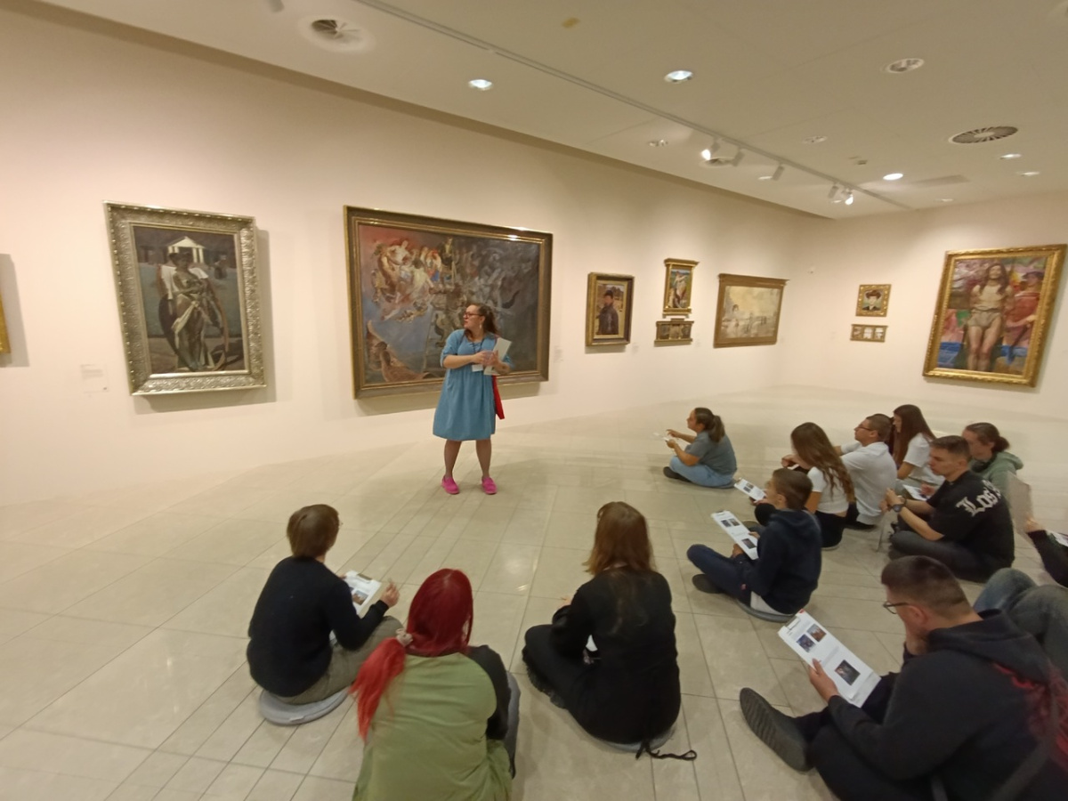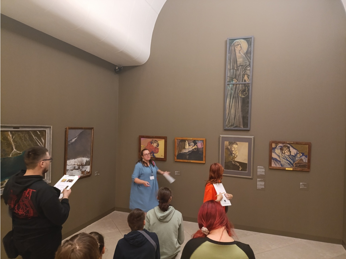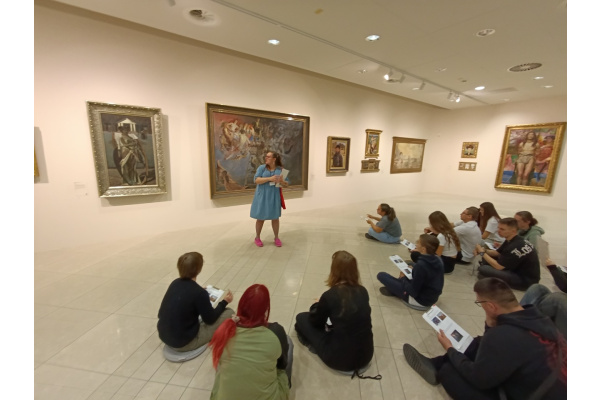 Pierwsza grupa miała okazję zanurzyć się w świat Młodej Polski, zgłębiając bogactwo zjawisk artystycznych i kierunków, które kształtowały przełom XIX i XX wieku. Na podstawie dzieł z poznańskiej galerii, uczniowie analizowali program epoki, symbolikę młodopolską oraz konteksty związane z atmosferą fin de siècle. Zajęcia pozwoliły lepiej zrozumieć, jak artyści tego okresu wyrażali niepokoje i duchową głębię swoich czasów.
