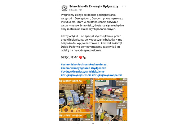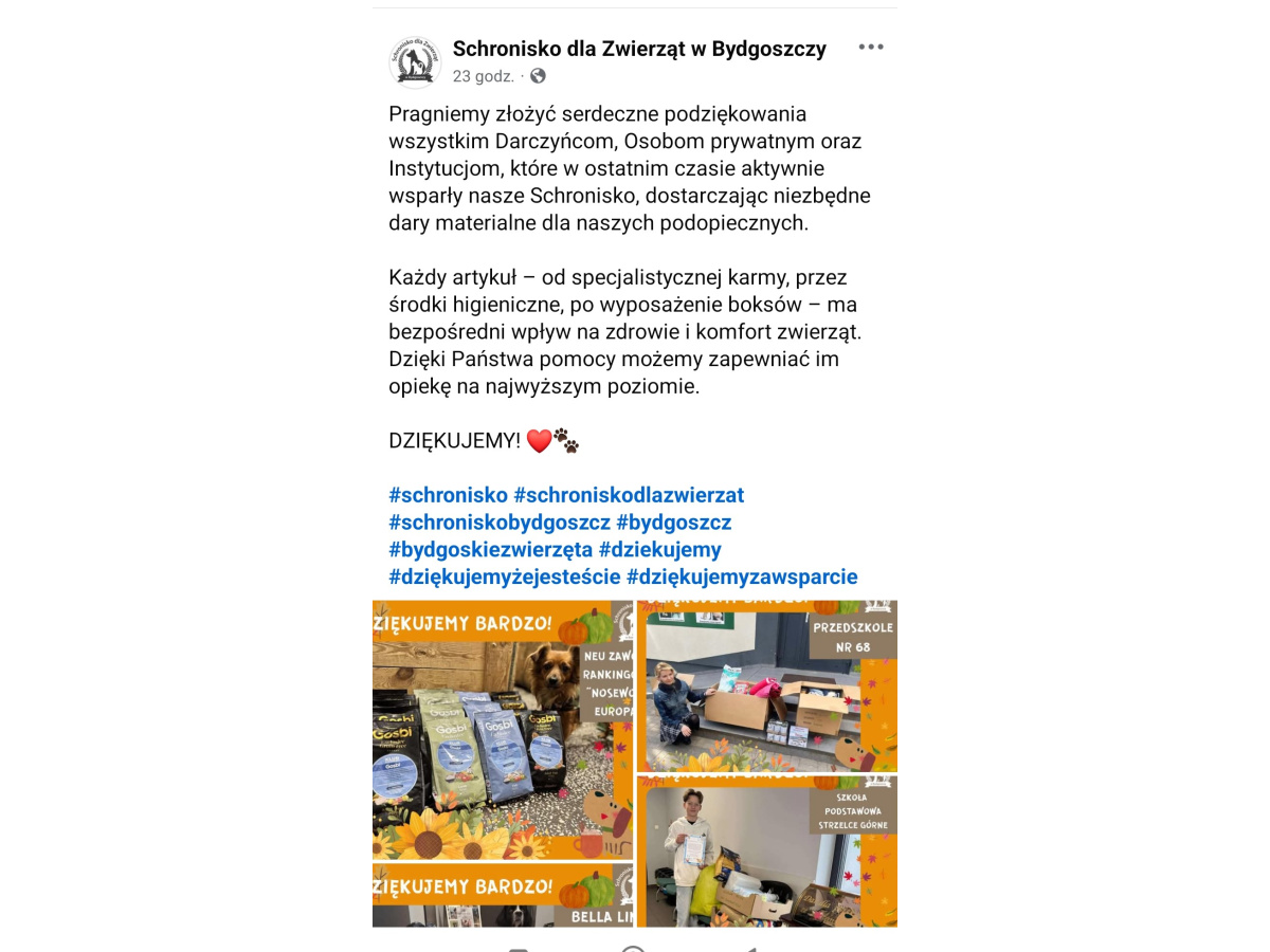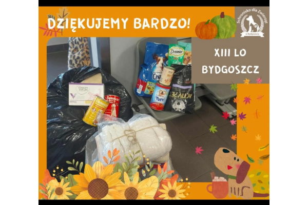 Nasza szkolna zbiórka na Schronisko dla zwierząt w Bydgoszcz dobiegła końca. Wolontariusze dostarczyli koce, karmę i środki czystości tak by zdążyć przed zimą.Serdeczne podziękowania dla wszystkich darczyńców!